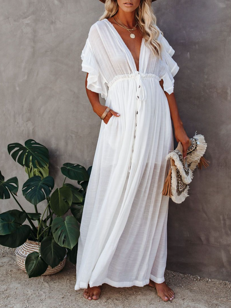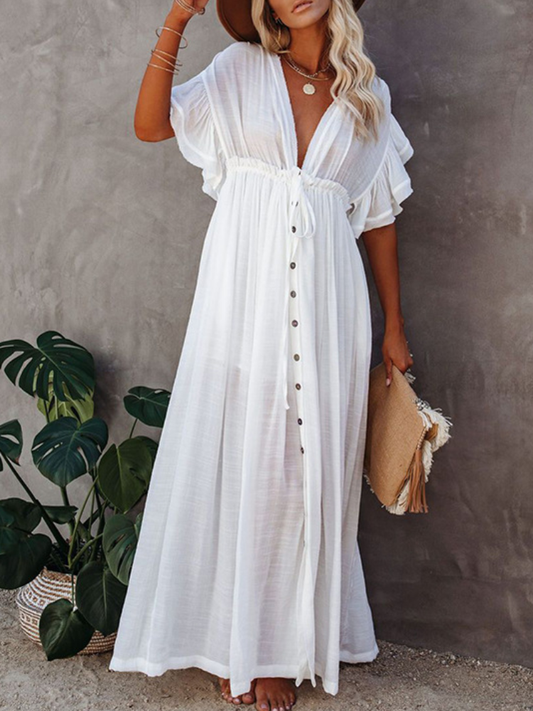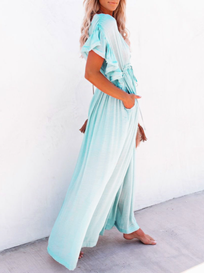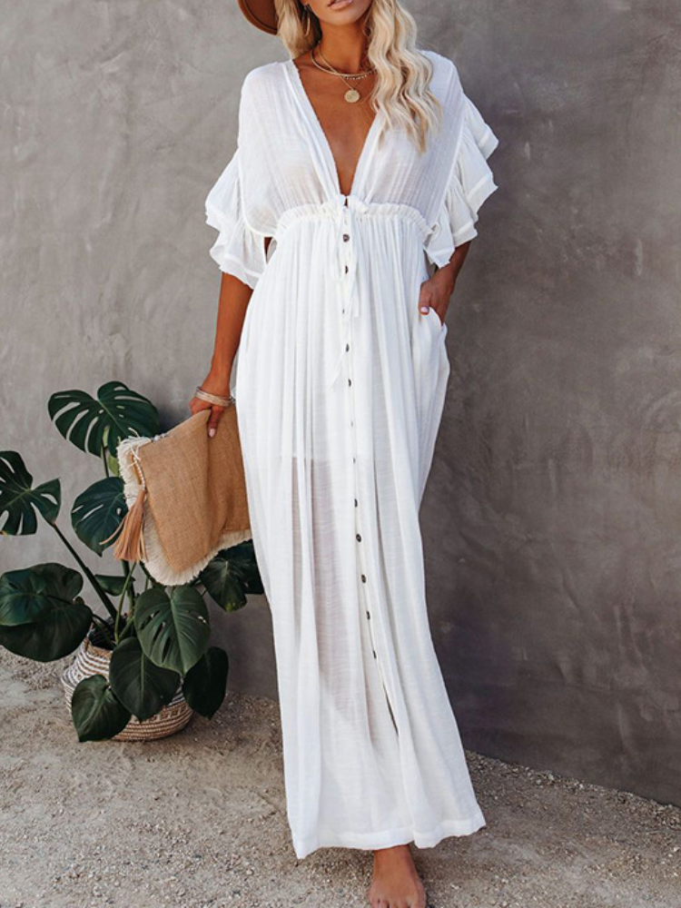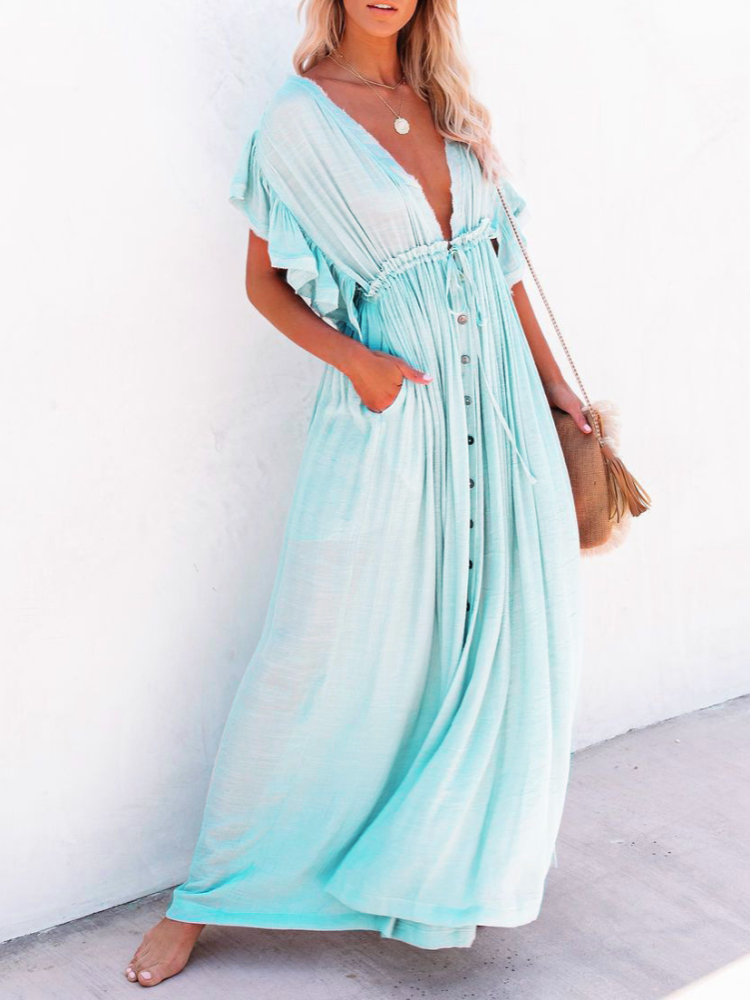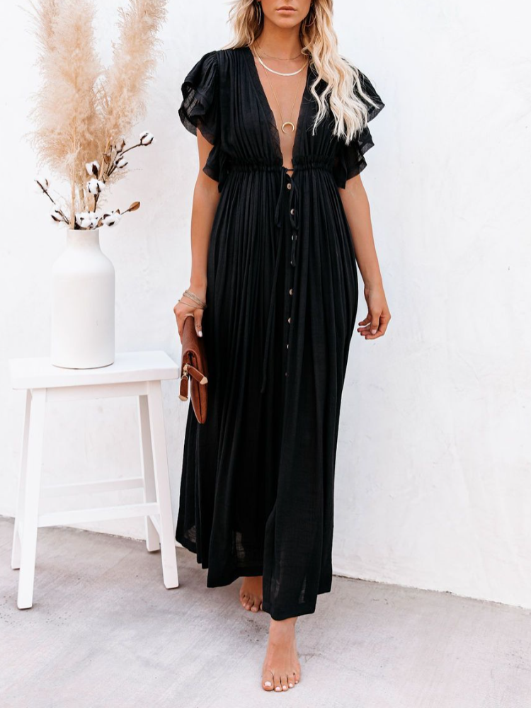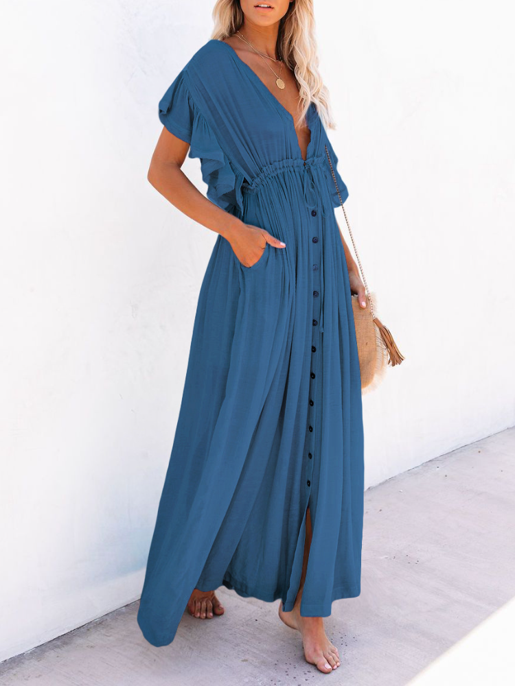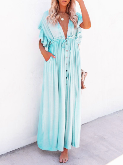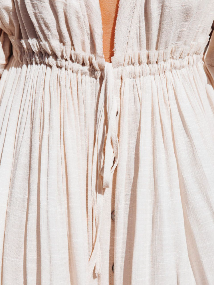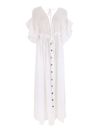 Bamboo Waist Rope Kaftan Long Dress Cardigan Holiday Beach Sun-protective Long Dress