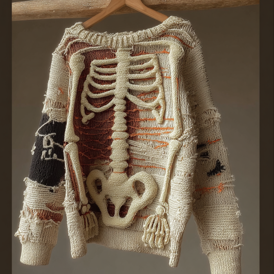 Halloween Skeleton Man Pattern Knit Round Neck Sweater