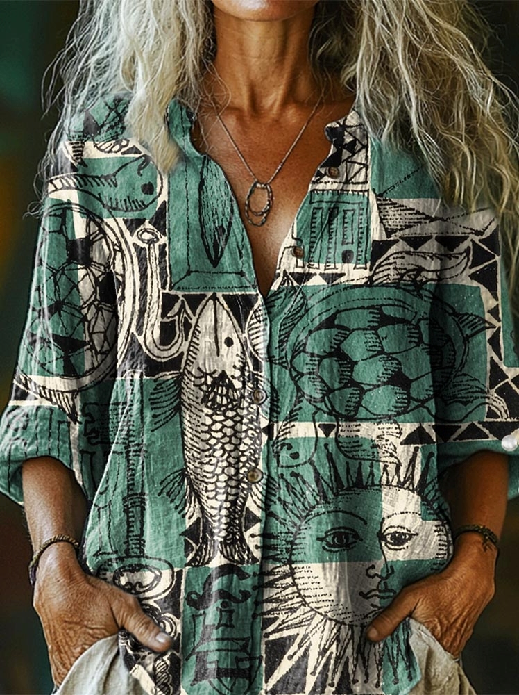 Women's Bohemian Vintage Folk Collage Art Print Casual Cotton Linen Shirt