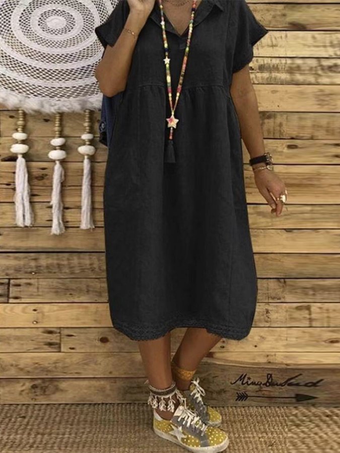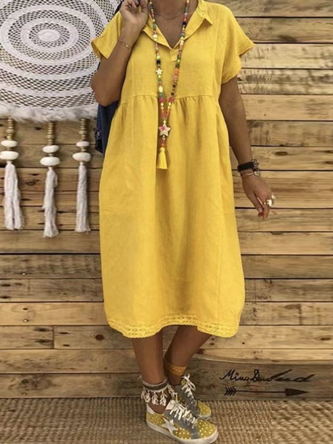 Women's Casual Solid Color V-Neck Cotton Dress