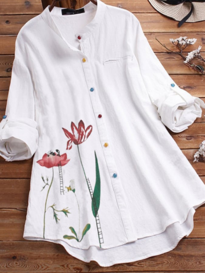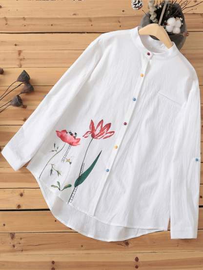 Women's Cotton Linen Lotus Print Color Button Stand Collar Long Sleeve Shirt