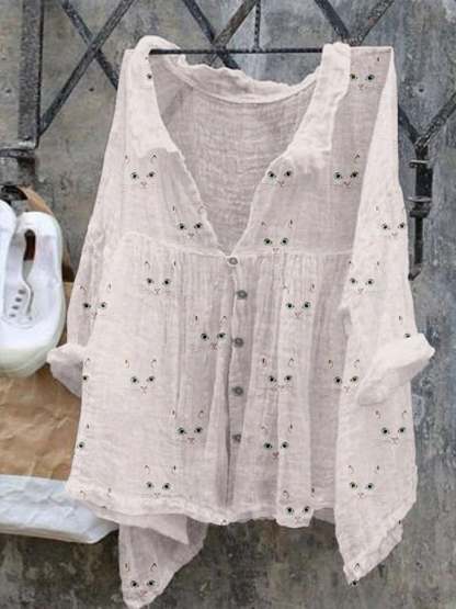Women's Cute Cat Face Print Cotton And Linen Shirt