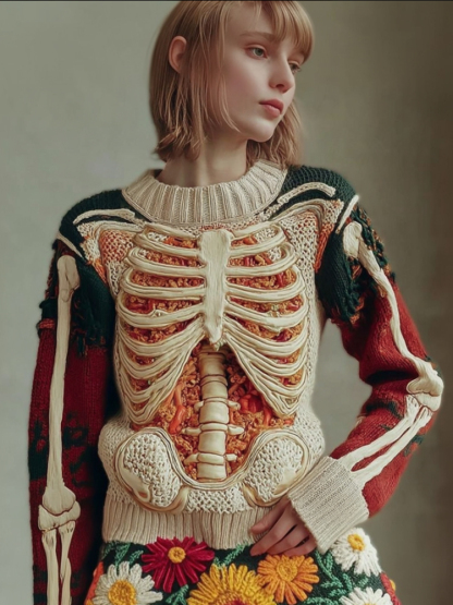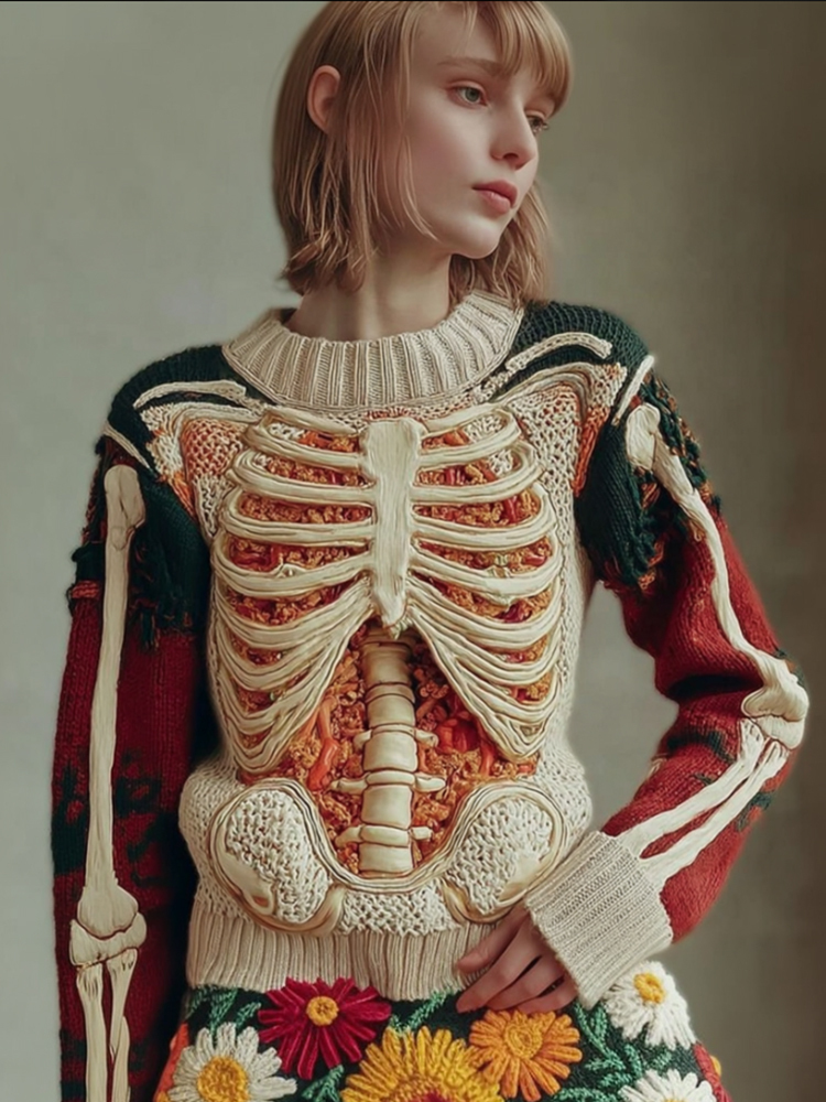 Women's Halloween Skeleton Trunk Art Flower Round Neck Sweater