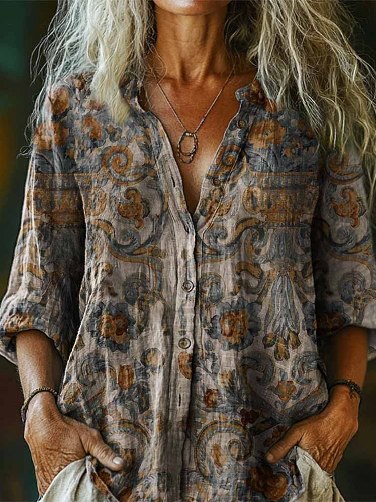 Women's Vintage Ethnic Floral Art Print Casual Cotton Linen Shirt