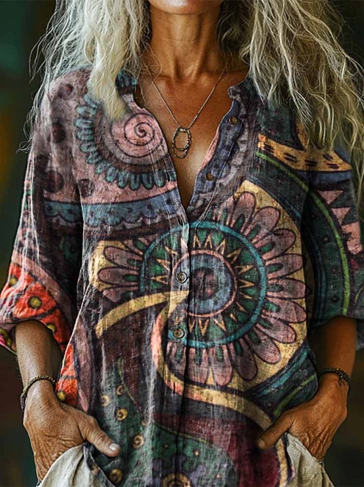 Women's Vintage Mandala Paisley Art Print Casual Cotton Linen Shirt