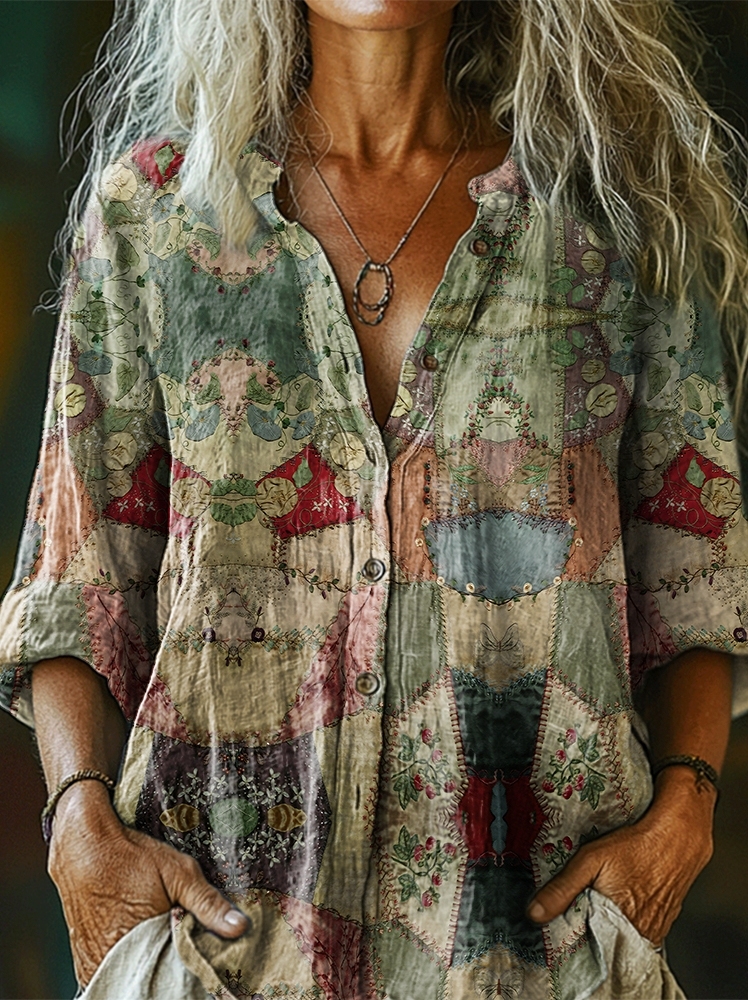 Women's Vintage Patchwork Hippie Art Print Linen Cotton V-neck Casual Shirt