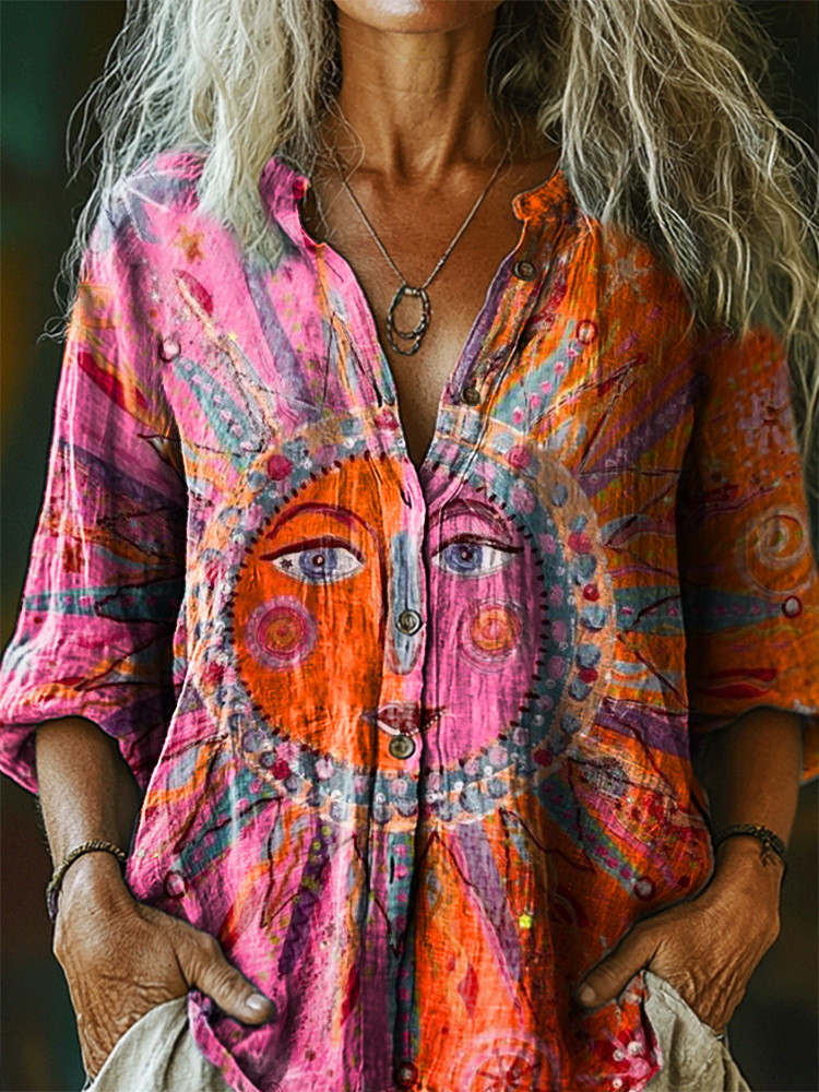 Women's Vintage Sunfloral Art Print Casual Cotton Linen Shirt