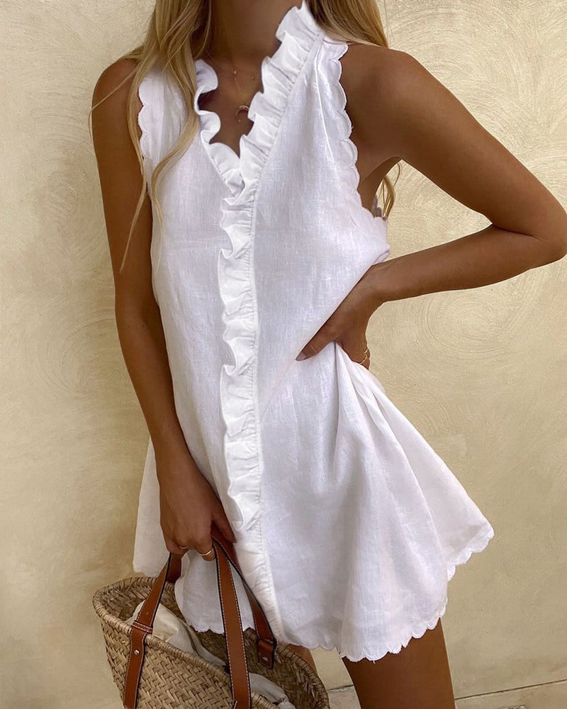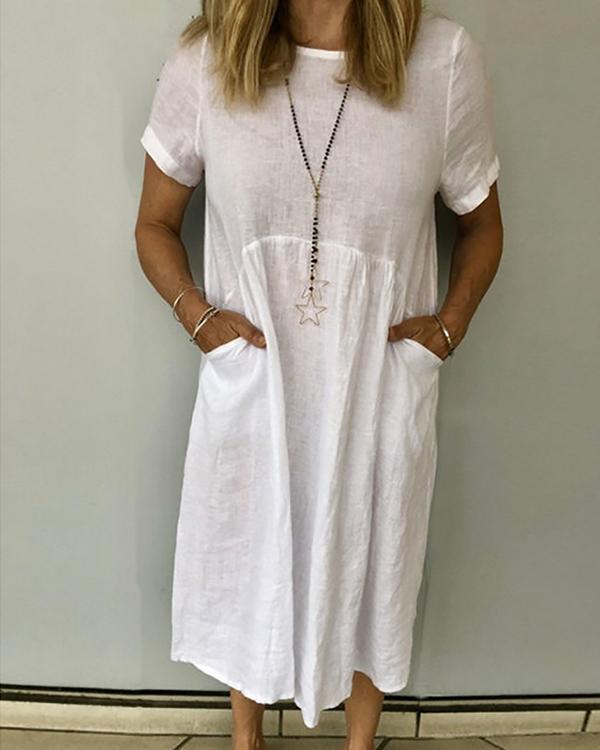 Women'S Casual Solid Color V-Neck Cotton And Linen Dress