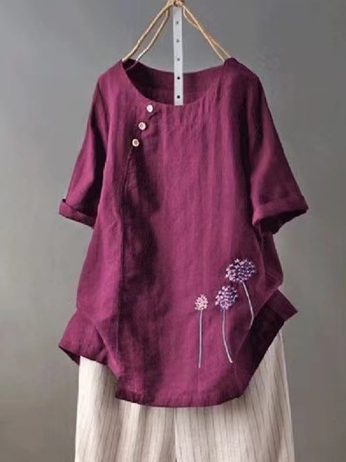 Women'S Embroidered Cotton And Linen O-Neck Button Short Sleeve Blouse