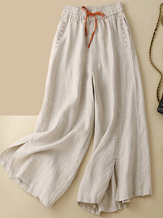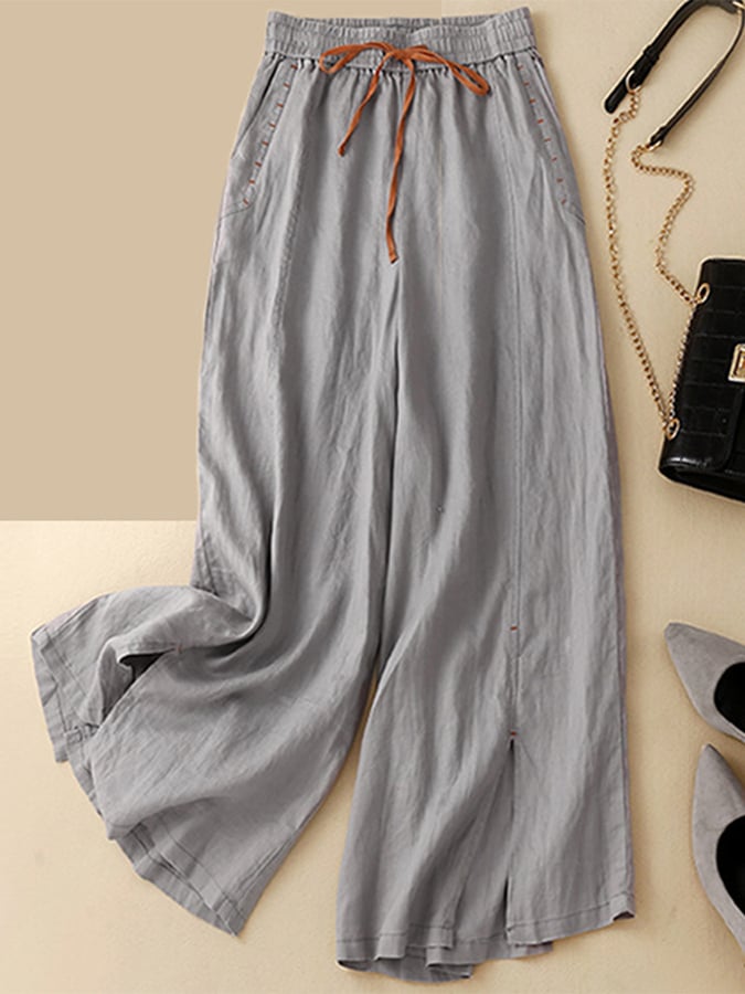 Cotton And Linen Contrasting Color Drawstring Slit Loose Casual Pants