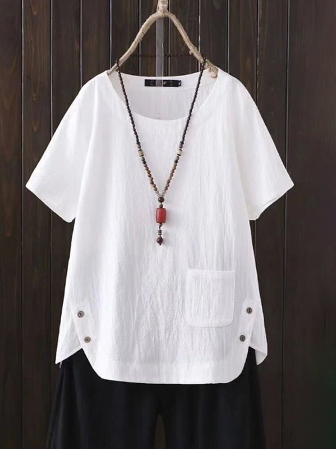 Women's Solid Color Cotton Linen Round Neck Button Short Sleeve Top