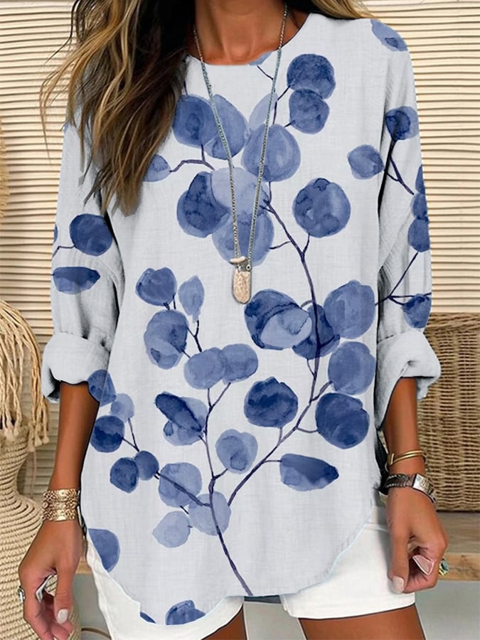 Women's Retro Botanical Floral Design Loose Long Sleeve Crew Neck Top