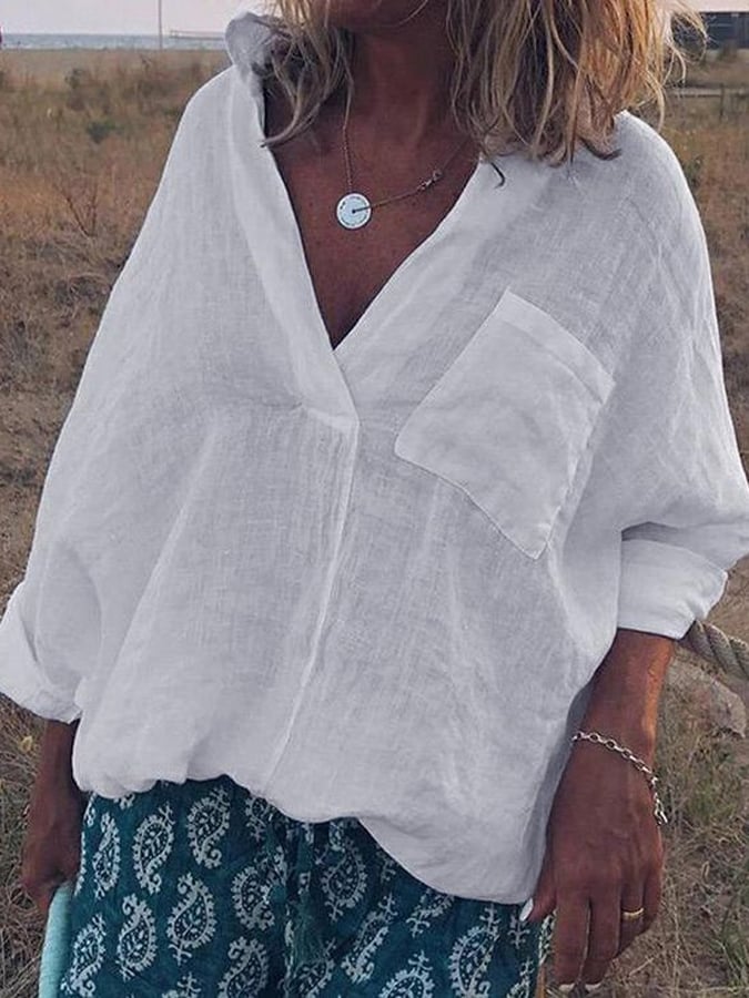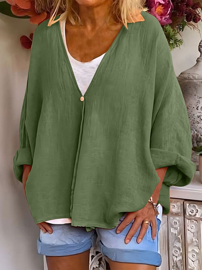Women's V-Neck Long Sleeve Loose Button Design Casual Shirt