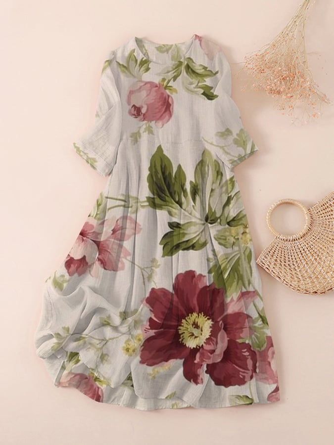 Women's Loose Casual Mid-Sleeve Cotton And Linen Shirt Dress
