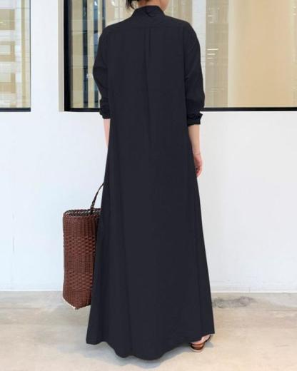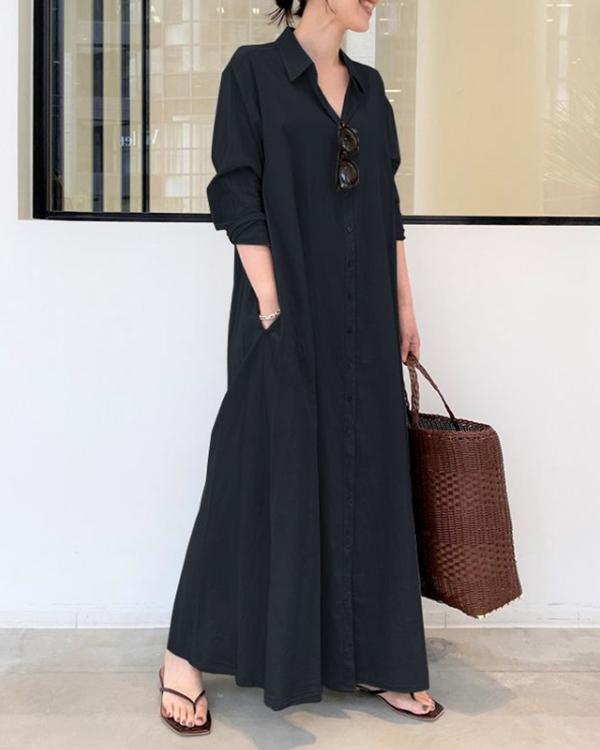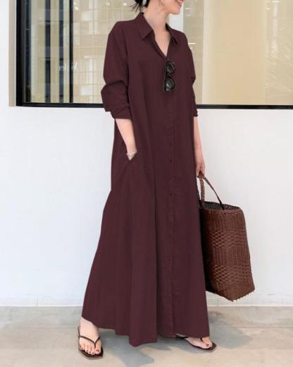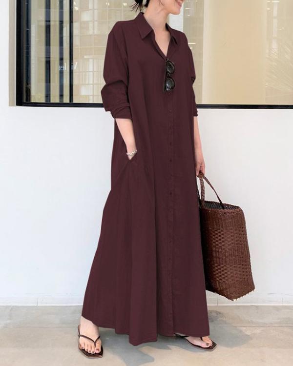 Casual Solid Cotton Linen Shirt Collar Long Sleeve Maxi Dress