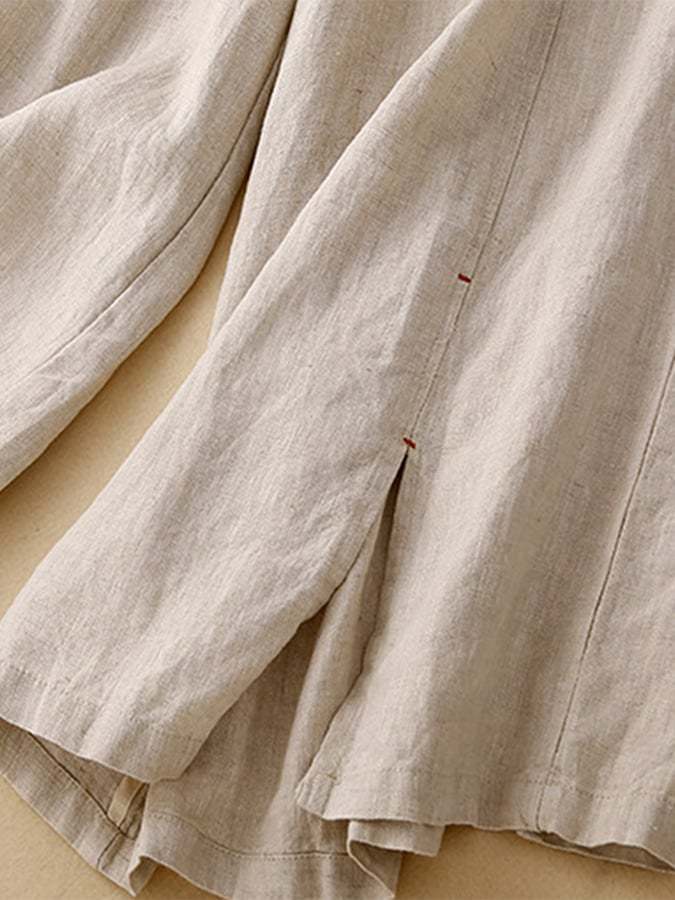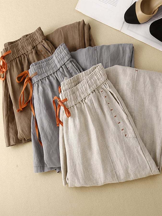 Cotton And Linen Contrasting Color Drawstring Slit Loose Casual Pants