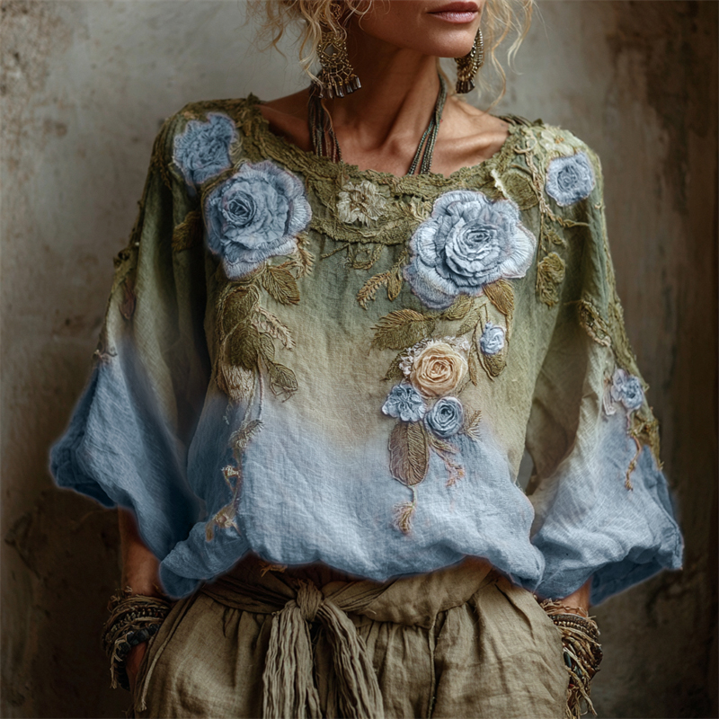 Vintage Pink Roses Forest Gradient Linen Tunic