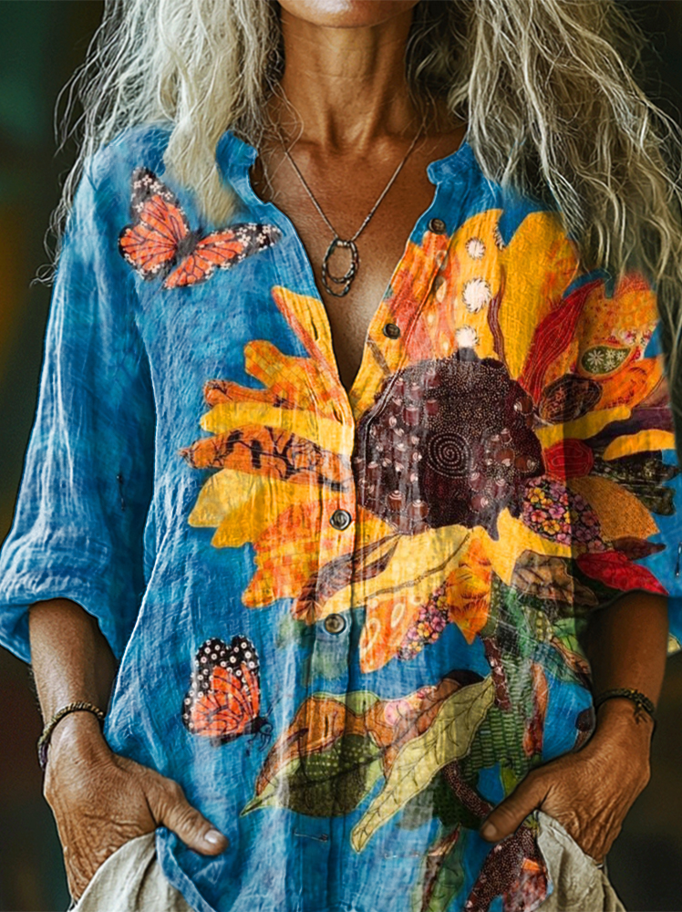 Women's Art Painting Sunflower Floral Vintage Print Long Sleeve Shirt