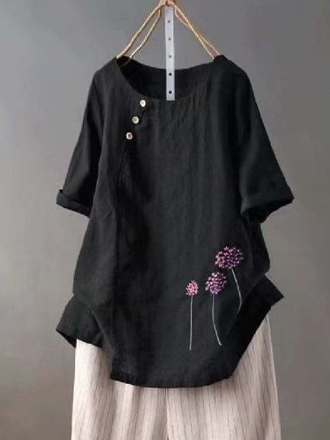 Women'S Embroidered Cotton And Linen O-Neck Button Short Sleeve Blouse