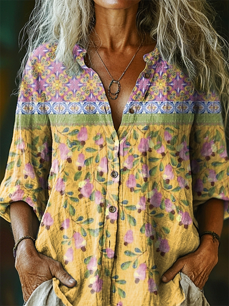 Women's Floral Pattern Art Print Linen Cotton Casual Shirt