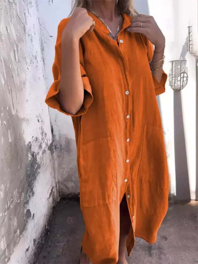 Women's Loose Casual Mid-Sleeve Cotton And Linen Shirt Dress