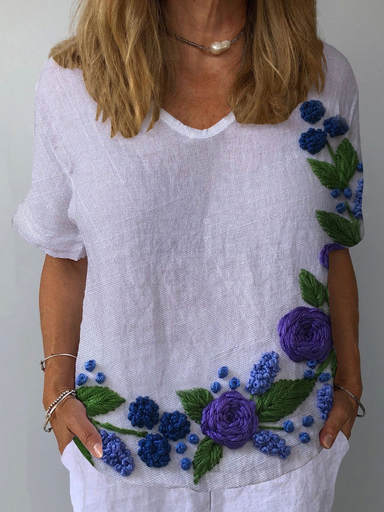 Women's Retro Floral Casual V-Neck Cotton And Linen Top