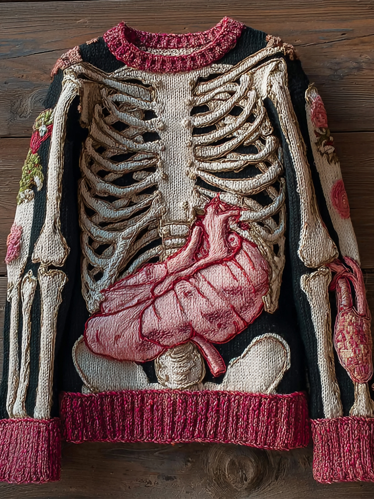 Women Halloween Human Bones Beating Red Heart Embroidery Antique Round Neck Sweater
