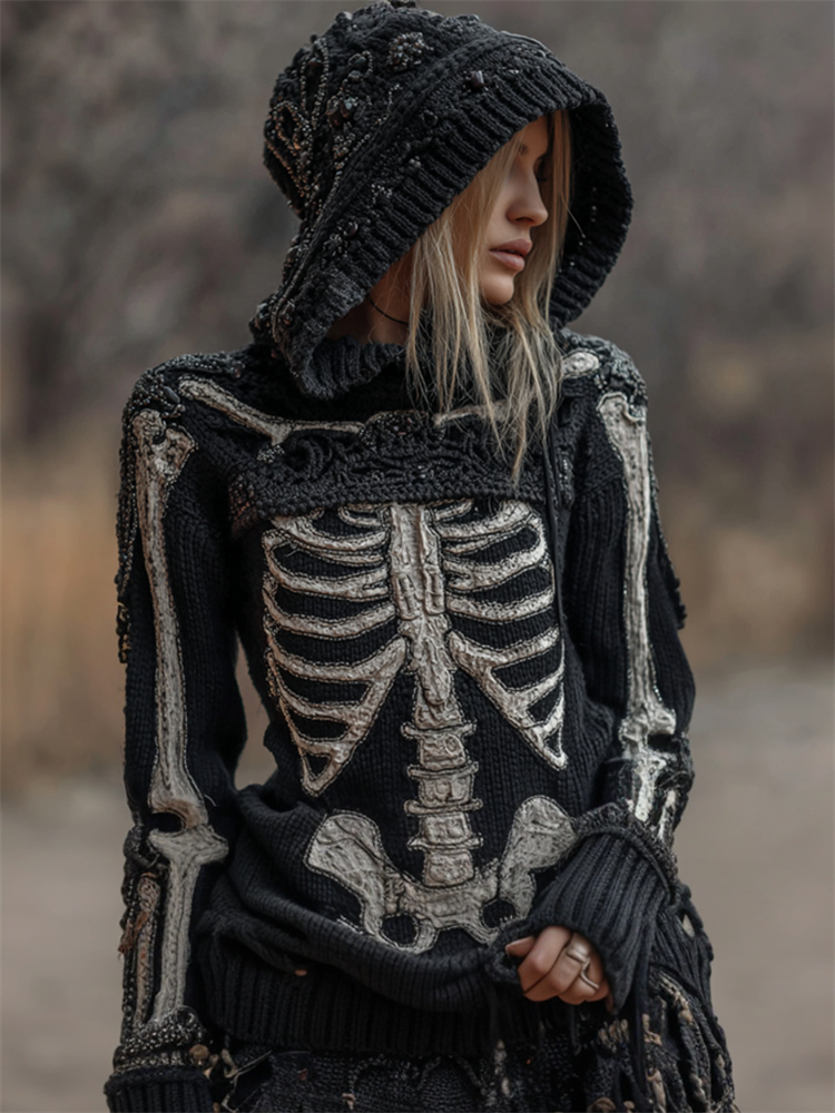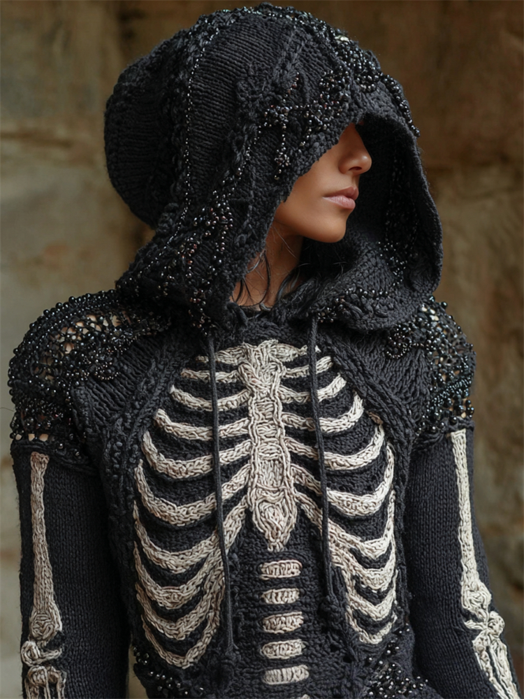 Vintage Gothic Skeleton Beaded Hooded Cozy Knit Sweater