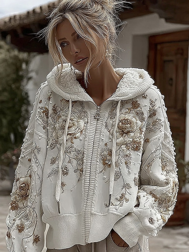 Women's White Rose Floral Embroidered Casual Zip-up Hoodie