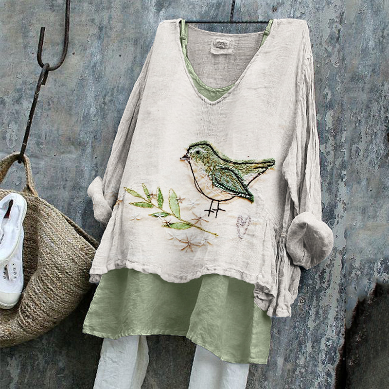 Bird & Leaves Floral Fiber Art Linen Tunic