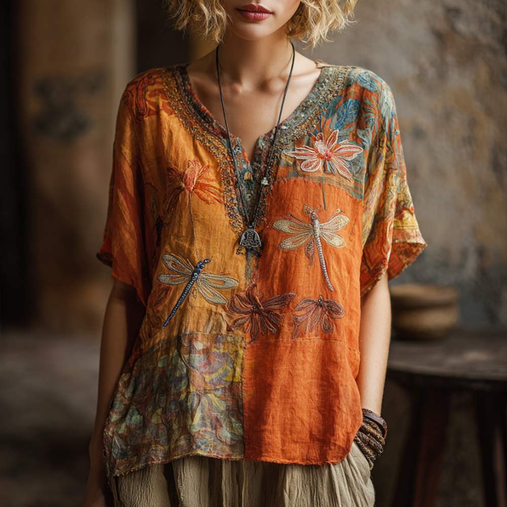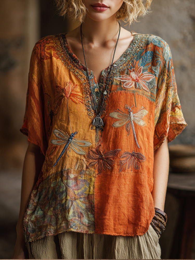 Bohemian-style Patchwork Dragonfly Three-dimensional Embroidery V-neck Short-sleeved Shirt