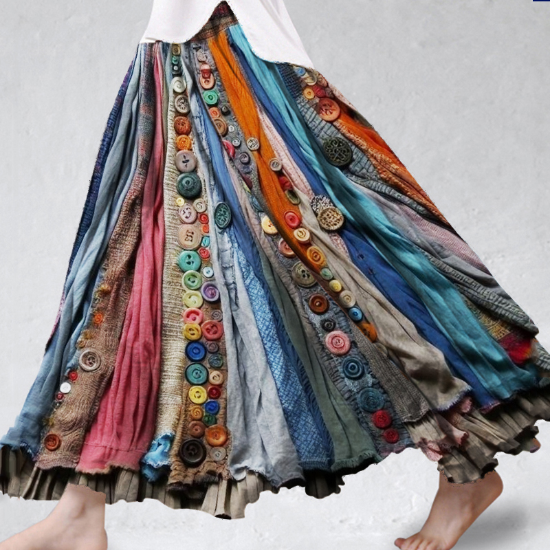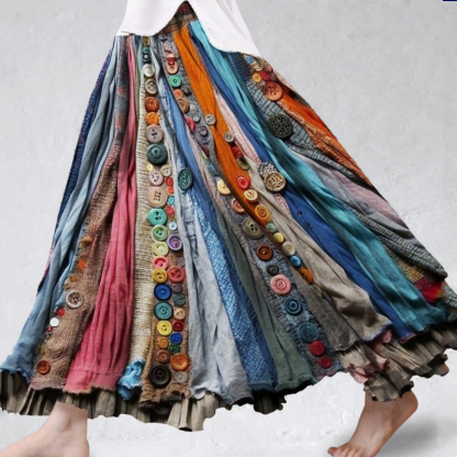 Boho Colorful Textile Flowy Linen Blend Wide Skirt
