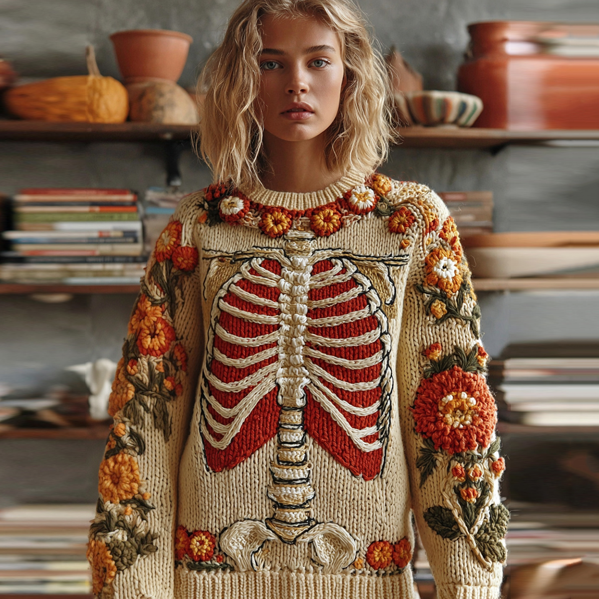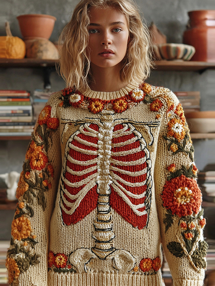 Classic Halloween Skeleton Bones With Floral Art Chunky Knitted Sweater