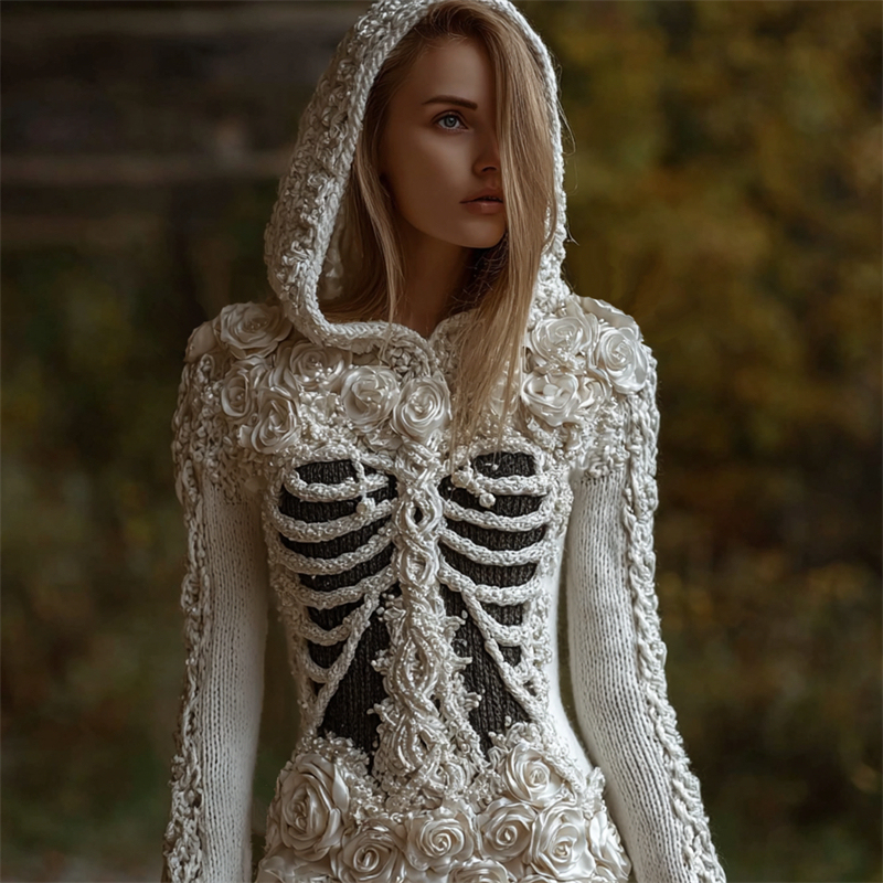 Elegant White Roses Beaded Skeleton Hooded Cozy Knit Sweater