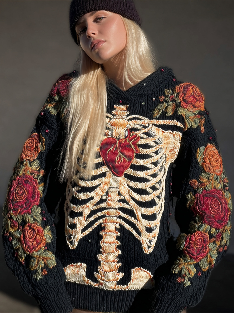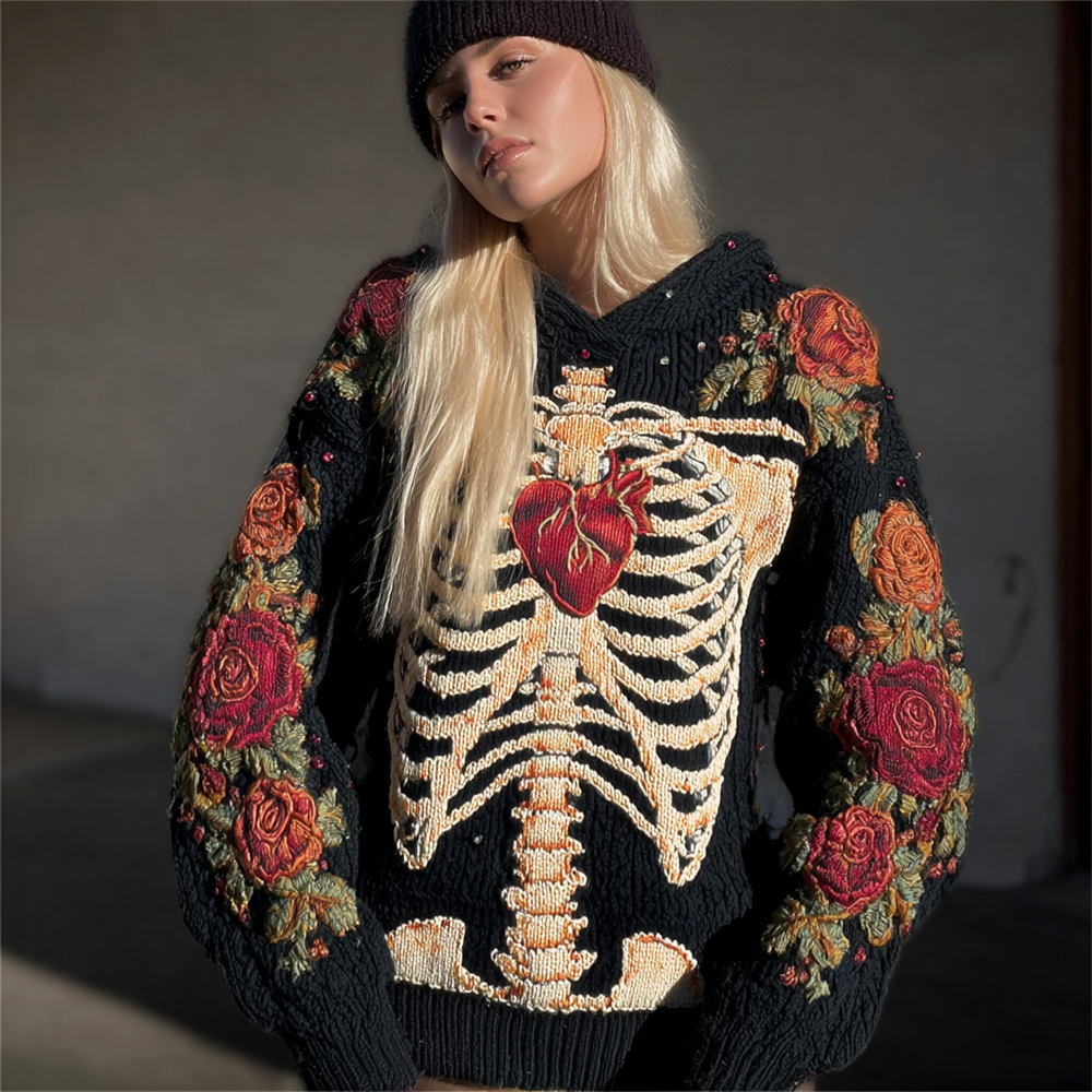 Halloween Human Skeleton & Floral Embroidery Women's Knit Sweater