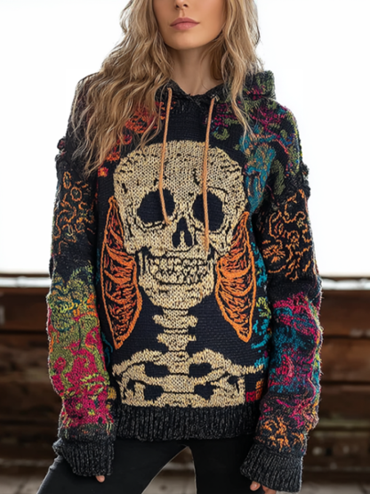 Halloween Skeleton Bone Pattern Design Women's Knit Hooded Sweater