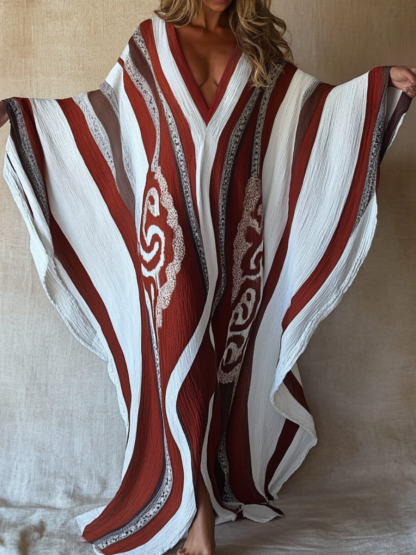 Ladies' Brushstroke Symphony Art Red-White Linen V-Neck Robe