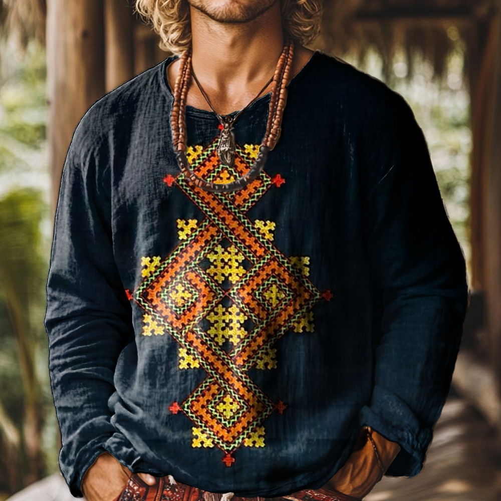 Men's Retro Ethnic Totem Printed Round Neck Long Sleeve Cotton Shirt