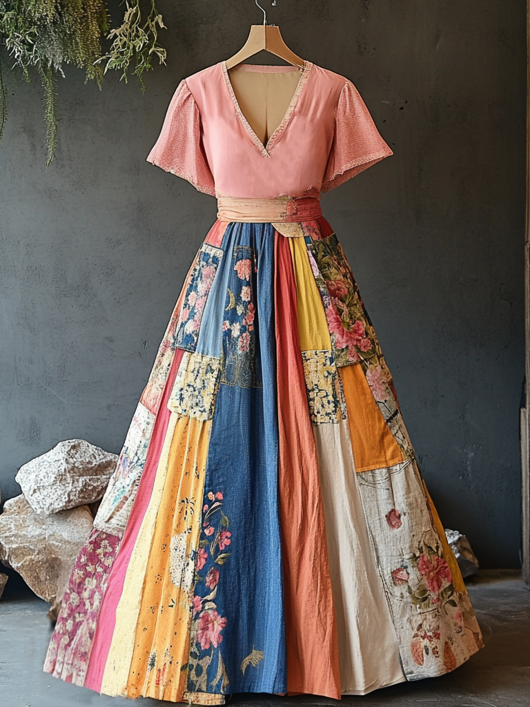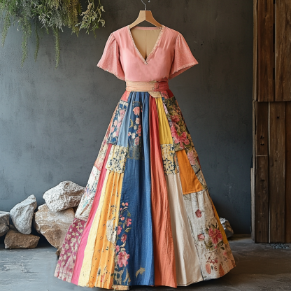 Retro Elegant Fashion Floral Patch V-neck Dress