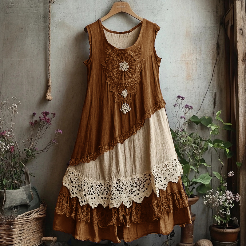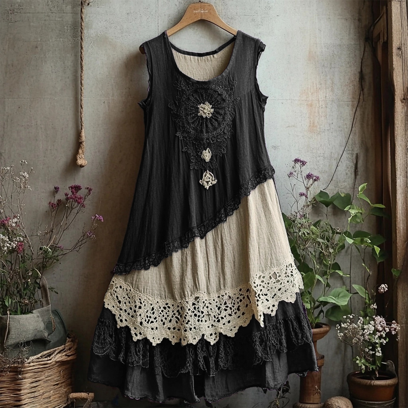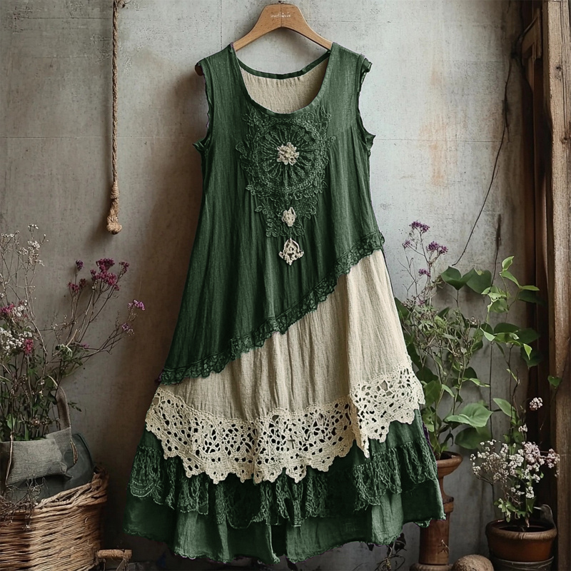 Retro Lace Patchwork Comfy Linen Tank Dress
