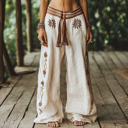 Vintage Bohemian Floral Ethnic Art Printed Cotton Linen Wide Leg Pants
