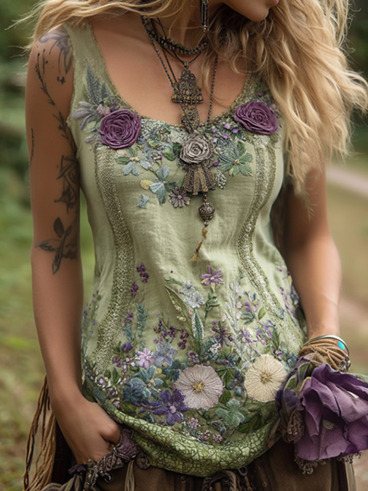 Vintage Classy Gradient Purple Lavender And Floral Embroidered Pattern Linen Tank Top