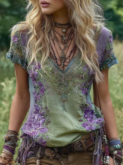 Vintage Flower Embroidery Linen V-neck Short Sleeve T-shirt
