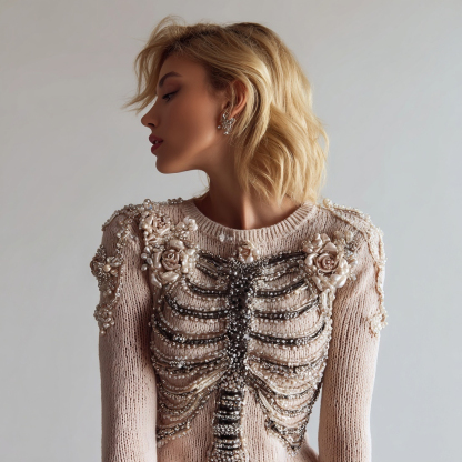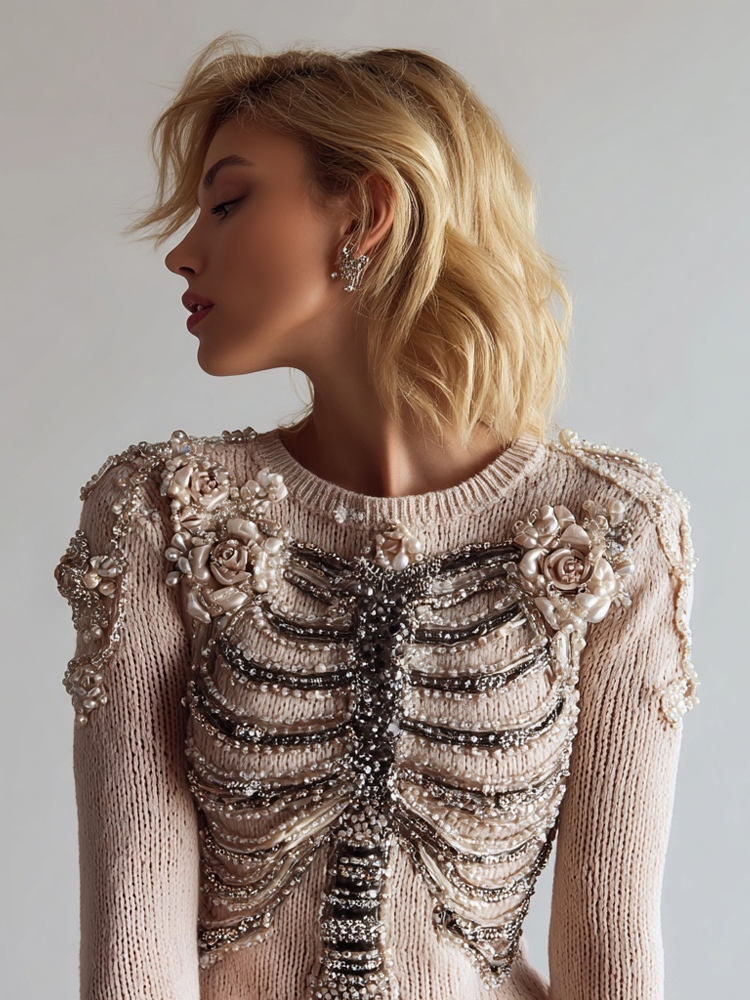 Vintage Glitter Skeleton Floral Embroidered Cozy Sweater