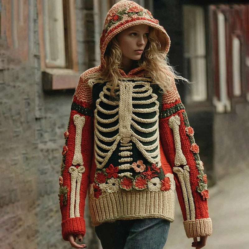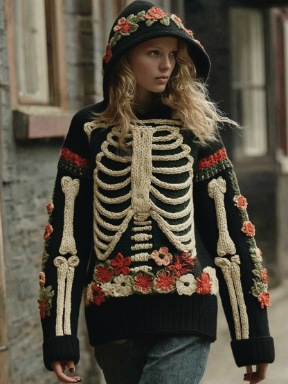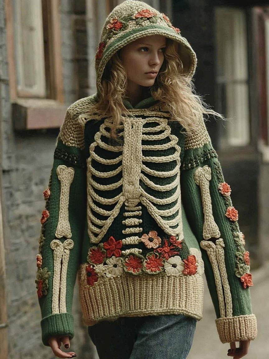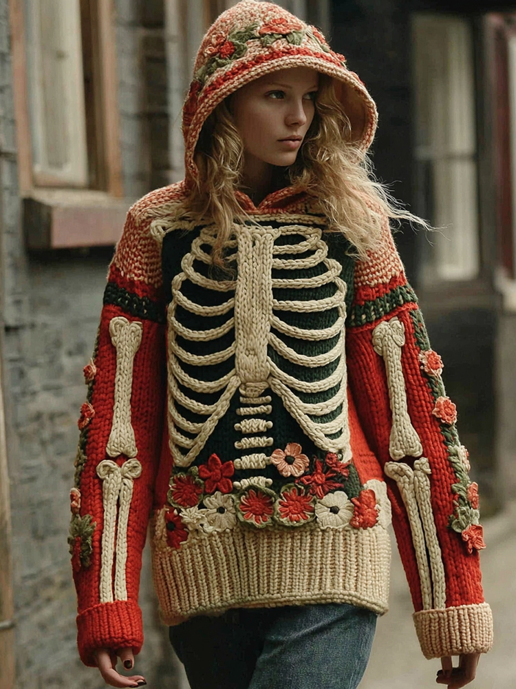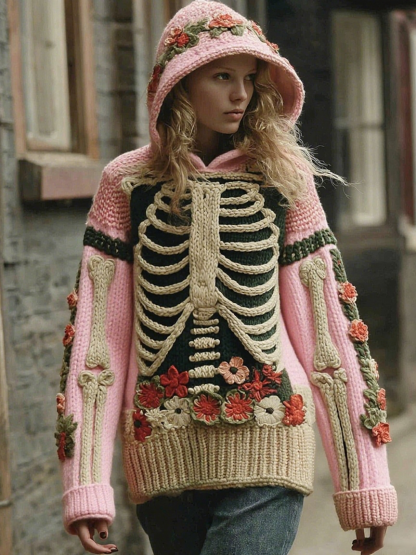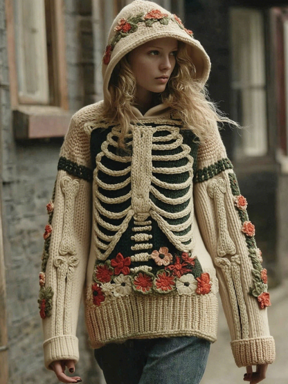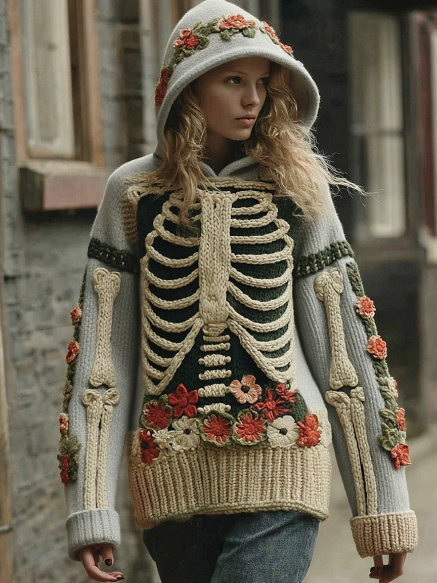 Vintage Halloween Anatomy With Floral Art Chunky Knitted Hooded Sweater
