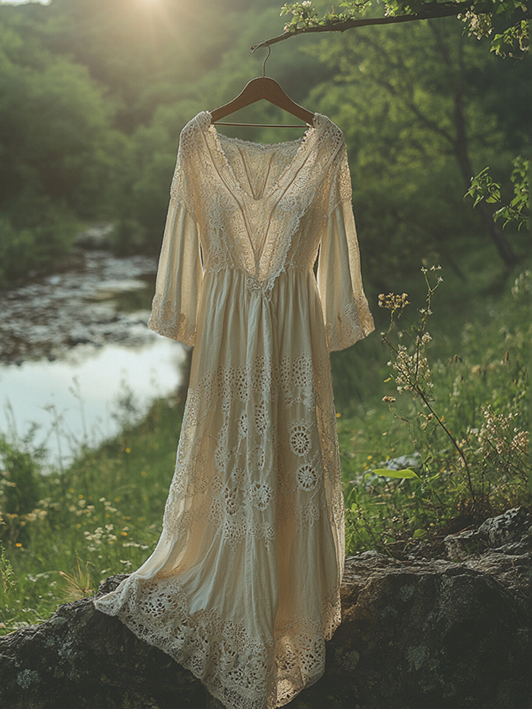 Vintage Lace Art Linen Maxi Dress