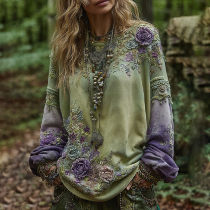 Vintage Purple Lavender And Floral Embroidered Casual Sweatshirt