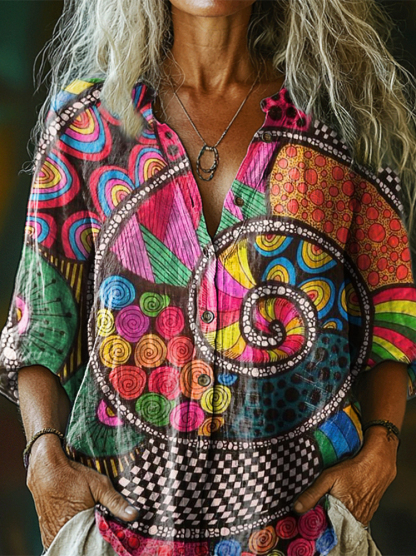 Women's Art Painting Rotating Color Patchwork Fun Print Long Sleeve Shirt
