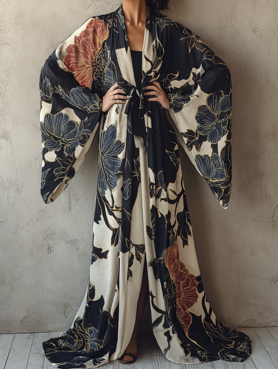Chic design: A black background with a blue peony and two red flowers embellished with a printed pattern, traditional kimono-style sleeves, and a belt perfectly outline the figure.