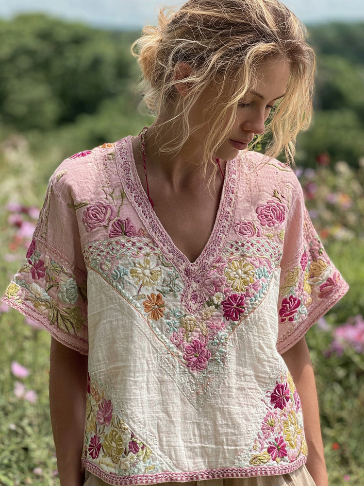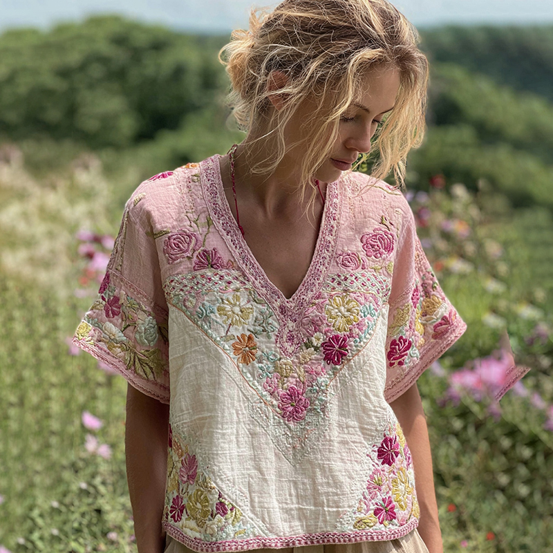 Women's Bohemian Contrast Patchwork Floral V-neck T-shirt